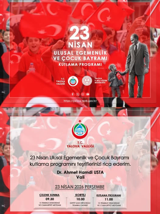 “Türkiye Büyük Millet Meclisi’nin açılışının 106. yıl dönümünü gururla kutladığımız bu anlamlı günde; Gazi Mustafa Kemal Atatürk’ün dünya çocuklarına armağan ettiği 23 Nisan Ulusal Egemenlik ve Çocuk Bayramı’nı hep birlikte büyük bir coşku ve heyecanla kutluyoruz. Yalova Valiliği himayelerinde, Yalova İl Millî Eğitim Müdürlüğümüz koordinesinde gerçekleştirilecek Kortej Yürüyüşü ve Kutlama Programı ile çocuklarımızın neşesi, umudu ve enerjisi eşliğinde; millî iradenin simgesi olan Türkiye Büyük Millet Meclisi’nin açılış ruhunu bir kez daha hep birlikte yaşayacağız.”